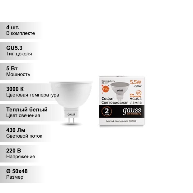 Лампочки (4 шт.) Светодиодная лампочка Gauss MR16, мощность 5.5 Вт, напряжение питания 220 В, цветовая температура 3000 К, теплый белый свет, световой поток 430 Лм, цоколь GU5.3, размер 50х50 мм