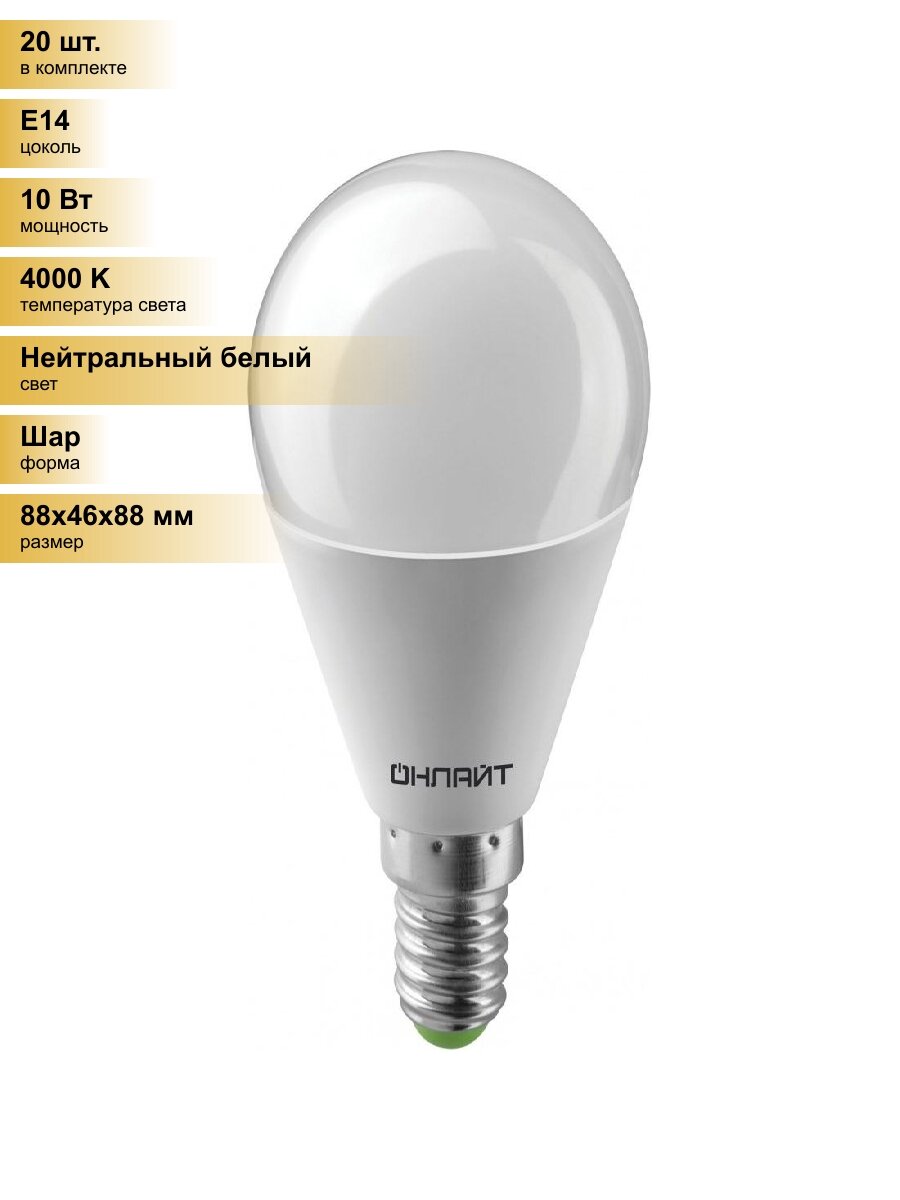 Лампочки (20 шт.) Светодиодная лампочка онлайт шар G45 E14 10W(750lm)4000K4K88х46 OLL-G45-10-230 4K-E14 61966 Нейтральный белый. Цоколь E14