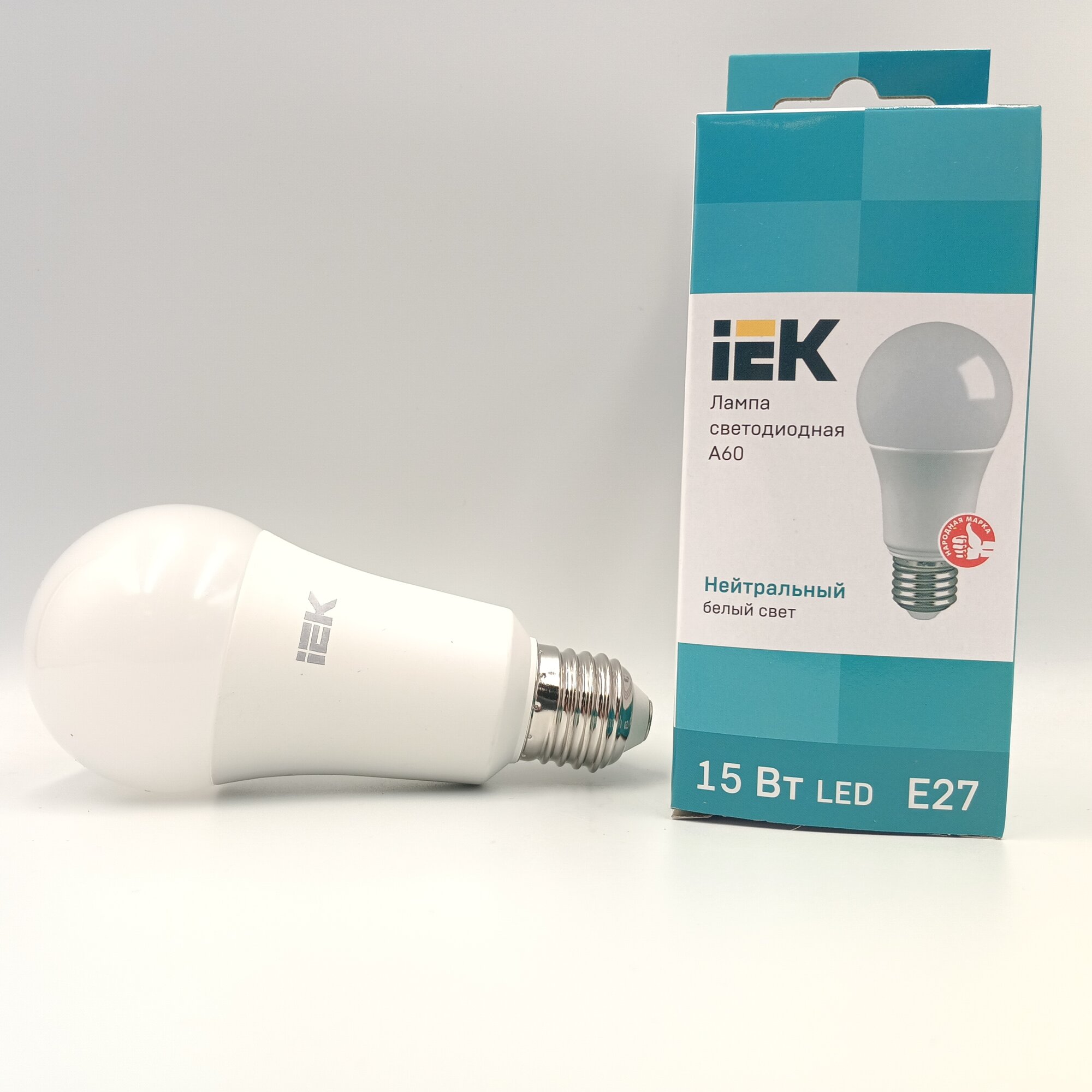 Лампочки (18 шт.) Светодиодная лампочка IEK A60, груша, мощность 15 Вт, напряжение питания 220 В, цветовая температура 4000 К, нейтральный белый свет, световой поток 1350 Лм, цоколь E27, размер 60х131 мм