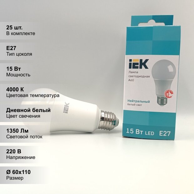 Лампочки (25 шт.) Светодиодная лампочка IEK A60, груша, мощность 15 Вт, напряжение питания 220 В, цветовая температура 4000 К, нейтральный белый свет, световой поток 1350 Лм, цоколь E27, размер 60х131 мм