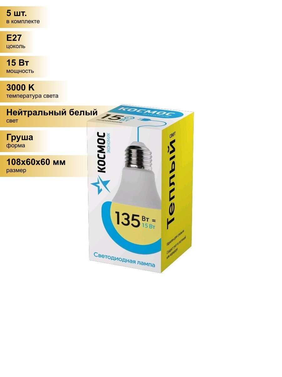 Лампочки (5 шт.) Светодиодная лампочка Космос ЛОН A60 E27 15W (1300lm) 3000K 2K матов. 108x60 LkecLED15wA60E2730 Нейтральный белый. Цоколь E27