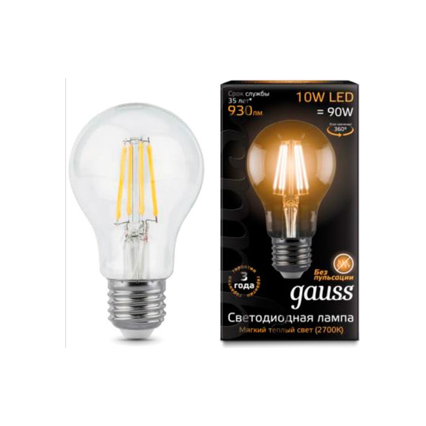 (5 шт.) Светодиодная лампочка Gauss A60 10Вт 150-265В 2700К E27 филамент 2 562 ₽ Подробнее