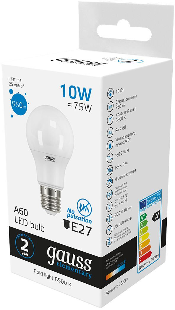(10 шт.) Светодиодная лампочка Gauss Elementary А60 10Вт 150-265Вт 4100K E27 2 205 ₽ Подробнее