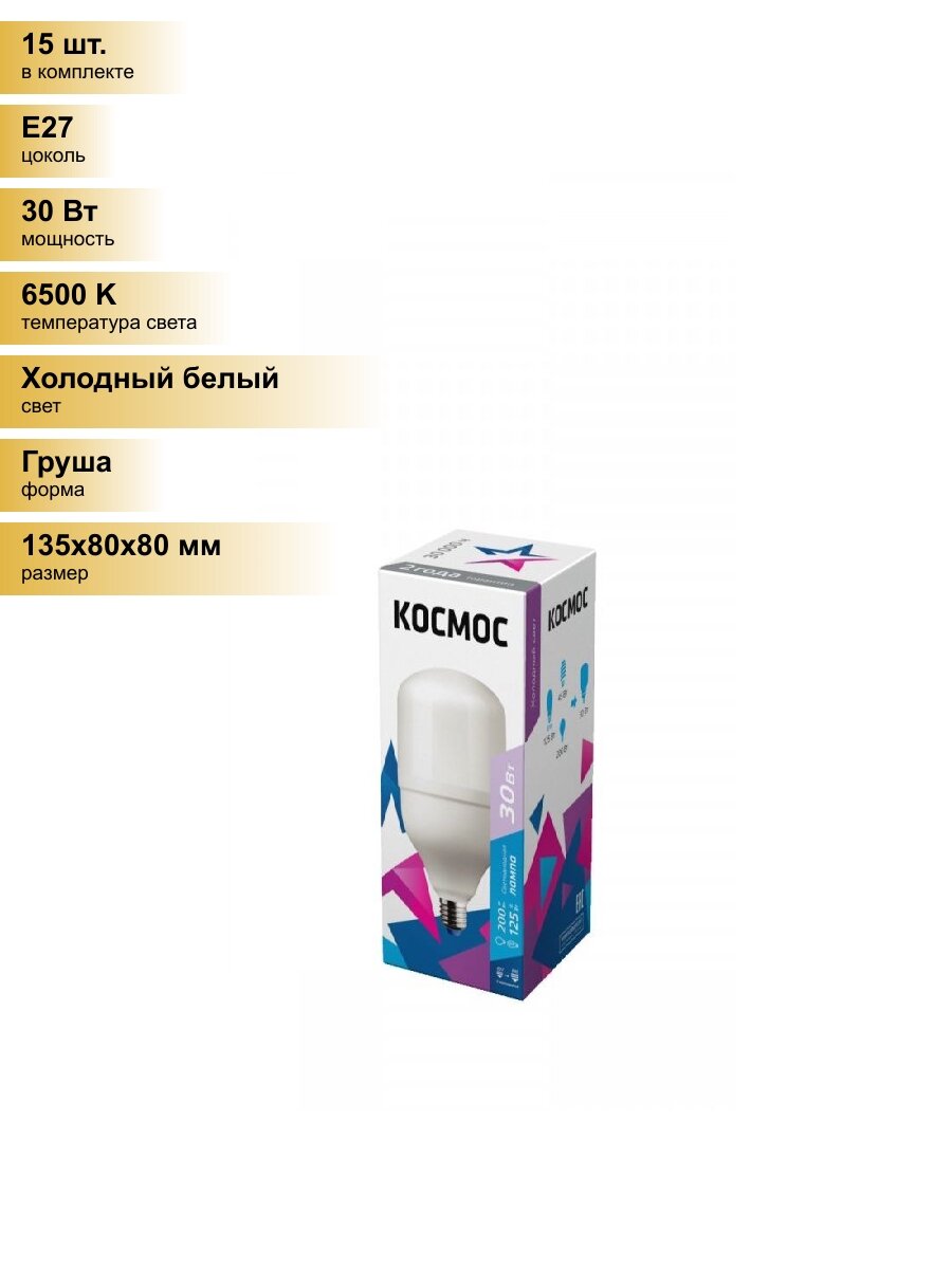 Лампочки (15 шт.) Светодиодная лампочка космос ЛОН A80 высокомощ E27 30W 2650lm 6500K 6K мат. 135x80 LksmHWLED30WE2765 Холодный белый. Цоколь E27