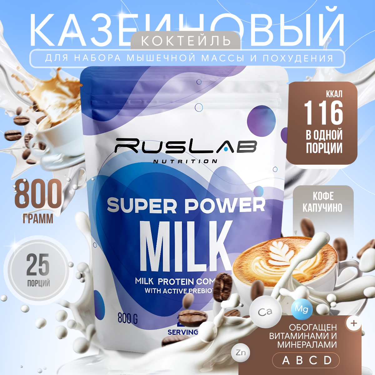 Протеин Казеиновый протеин SUPER POWER MILK, белковый коктейль (800 гр), вкус капучино