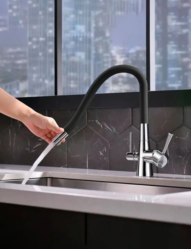 Смеситель для кухни с подключением к фильтру и гибким изливом Lemark Comfort хром/чёрный LM3075C
