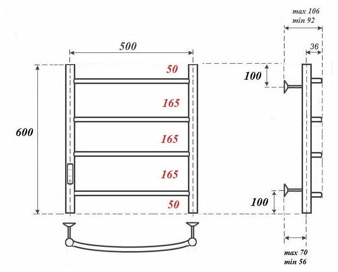 Полотенцесушитель электрический 500x600 POINT Афина (PN04756 П4) диммер слева