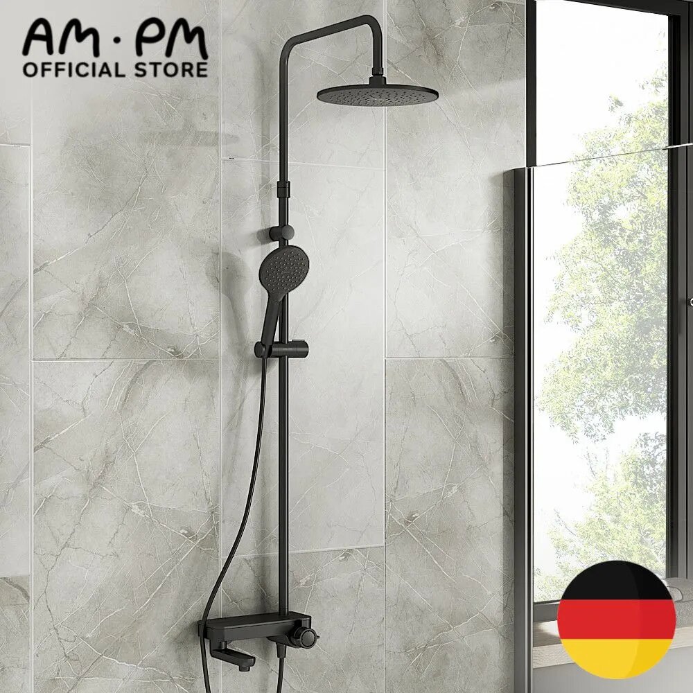 Душевая система с тропическим душем и смесителем хром AM.PM Сhic, смеситель с полкой, душевые системы для ванны с краном, с изливом, складной поворотный излив, увеличенный верхний душ, лейка 3 режима, Германия