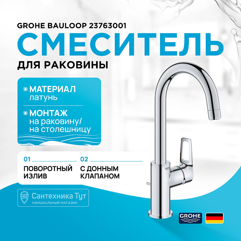 Смеситель для раковины GROHE BauLoop с ограничителем температуры и рычажным донным клапаном, размер L, хром (23763001)