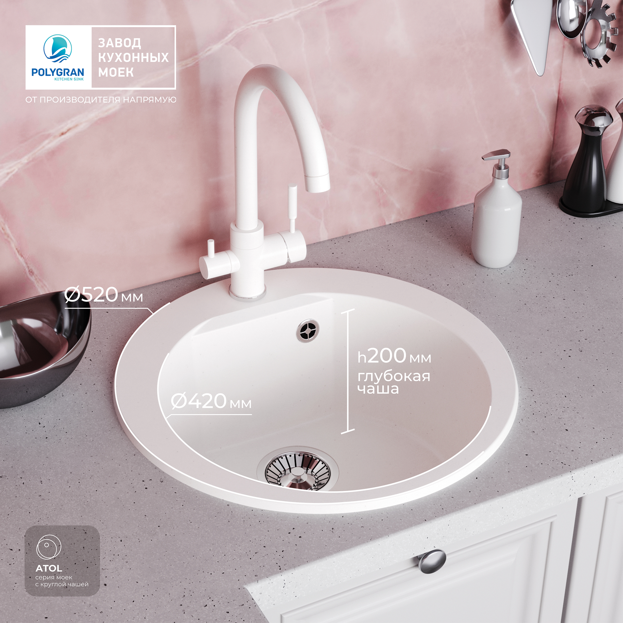 Мойки Polygran ATOL-520, мойка, мрамор, белый хлопок 36