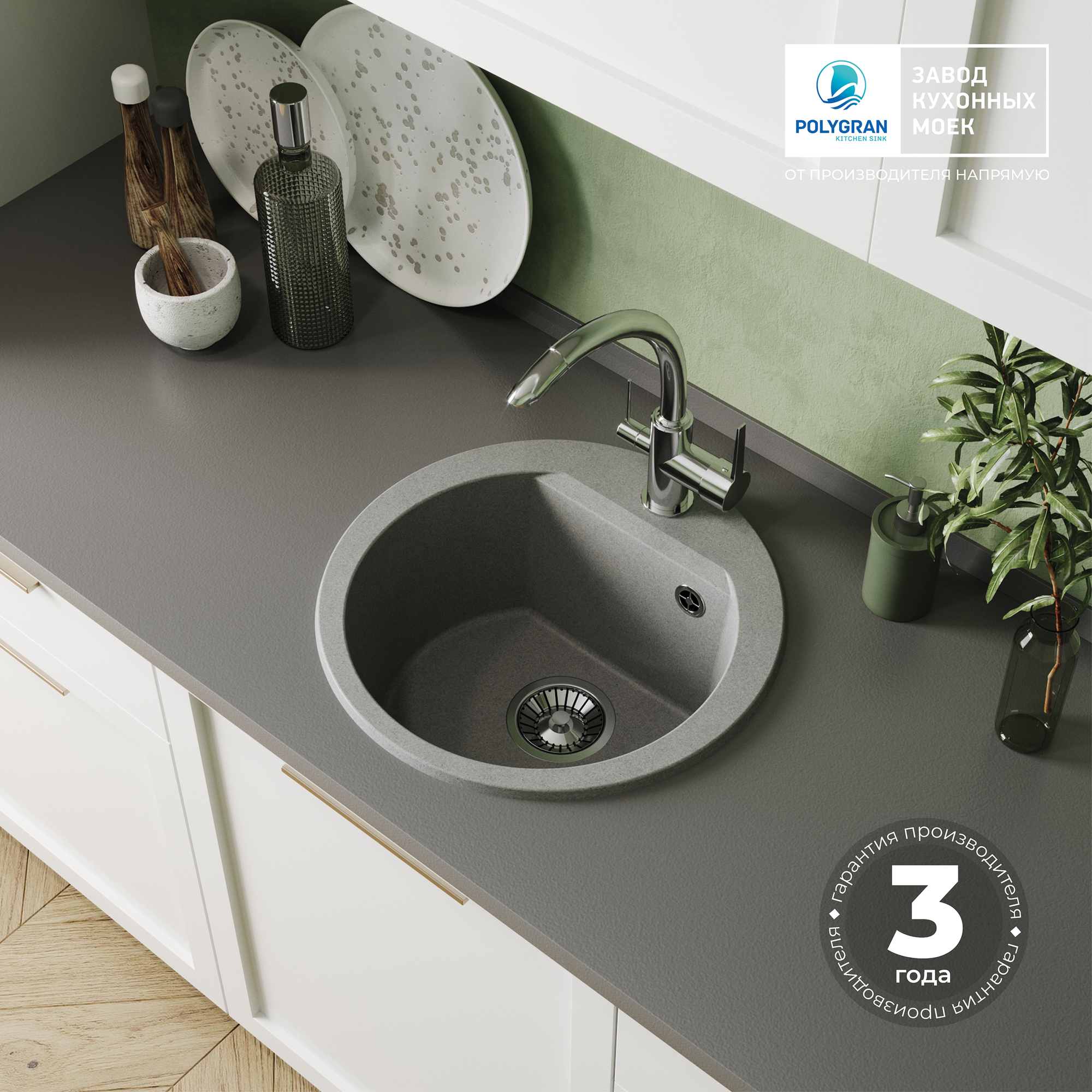 Мойка POLYGRAN, гранит-мрамор, ATOL-460, (d=460*200 мм), серый, сифон и сливная арматура в модуль 450