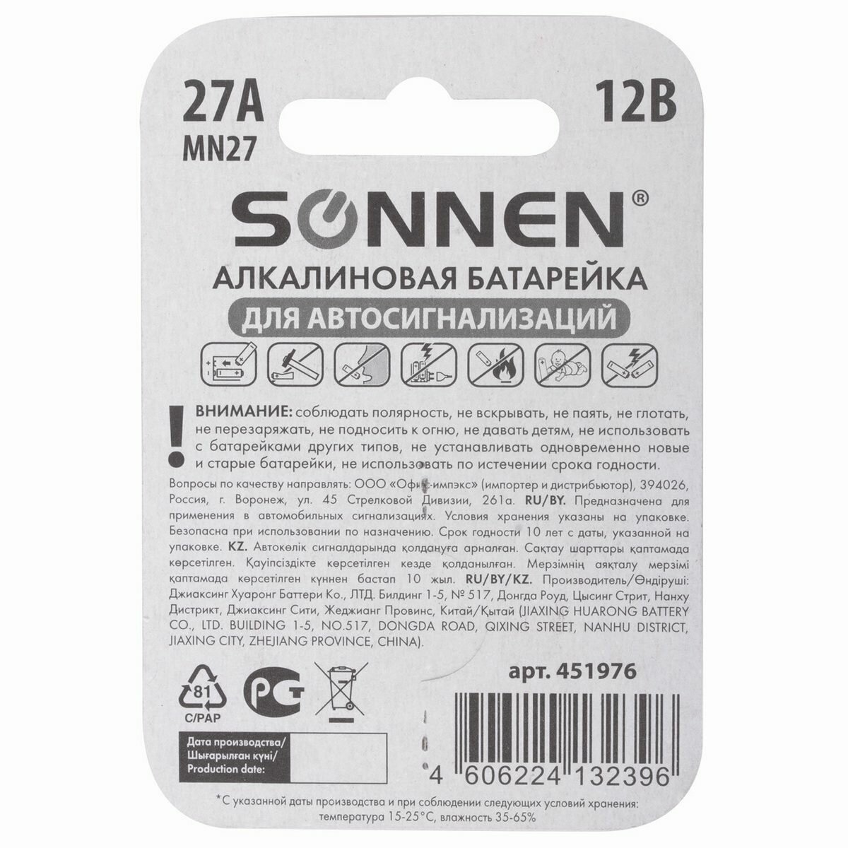 Батарейка SONNEN, 27А (MN27), алкалиновая, 1 шт., в блистере, 12 В (для автосигнализаций), 451976