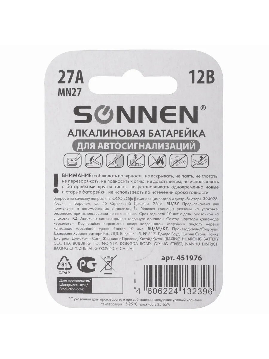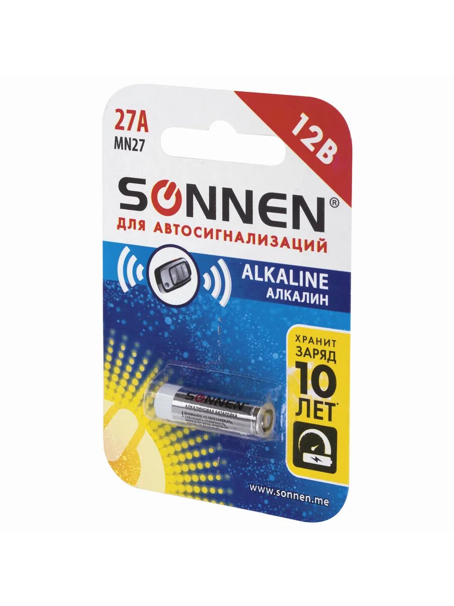 Батарейка SONNEN, 27А (MN27), алкалиновая, 1 шт., в блистере, 12 В (для автосигнализаций), 451976