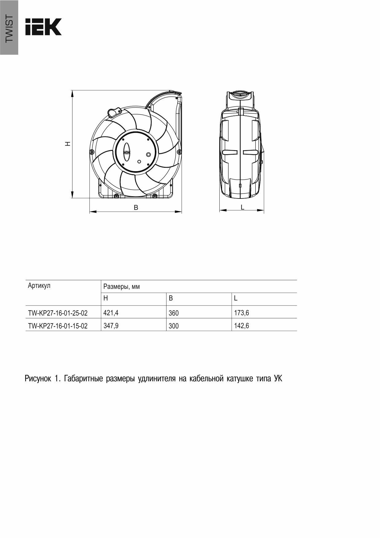 Сетевые фильтры и удлинители Удлинитель TWIST Катушка 1 место УК15 розетка 2P+PE/15м+2м 3х1,5мм2 автосмотка IEK