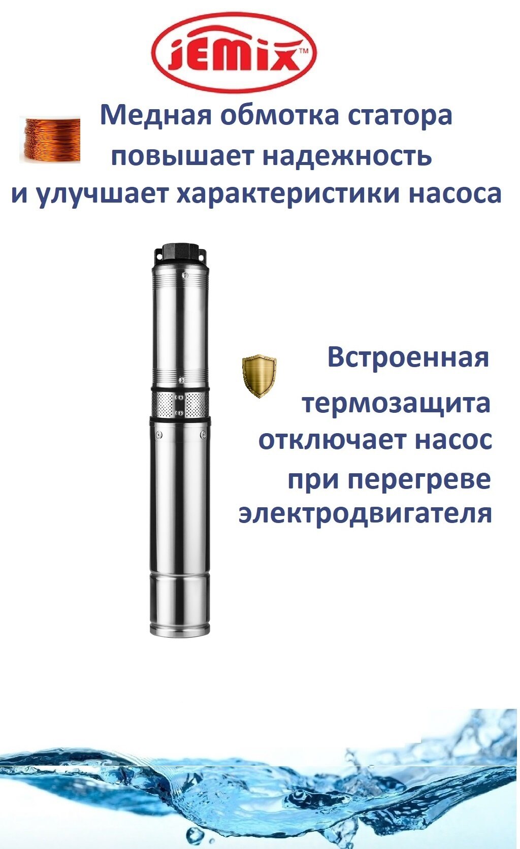 Насос скважинный, Jemix, 2 м, 1100 Вт, максимальный напор 80 м, 2 м³/ч, термозащита, СН 3-2-80