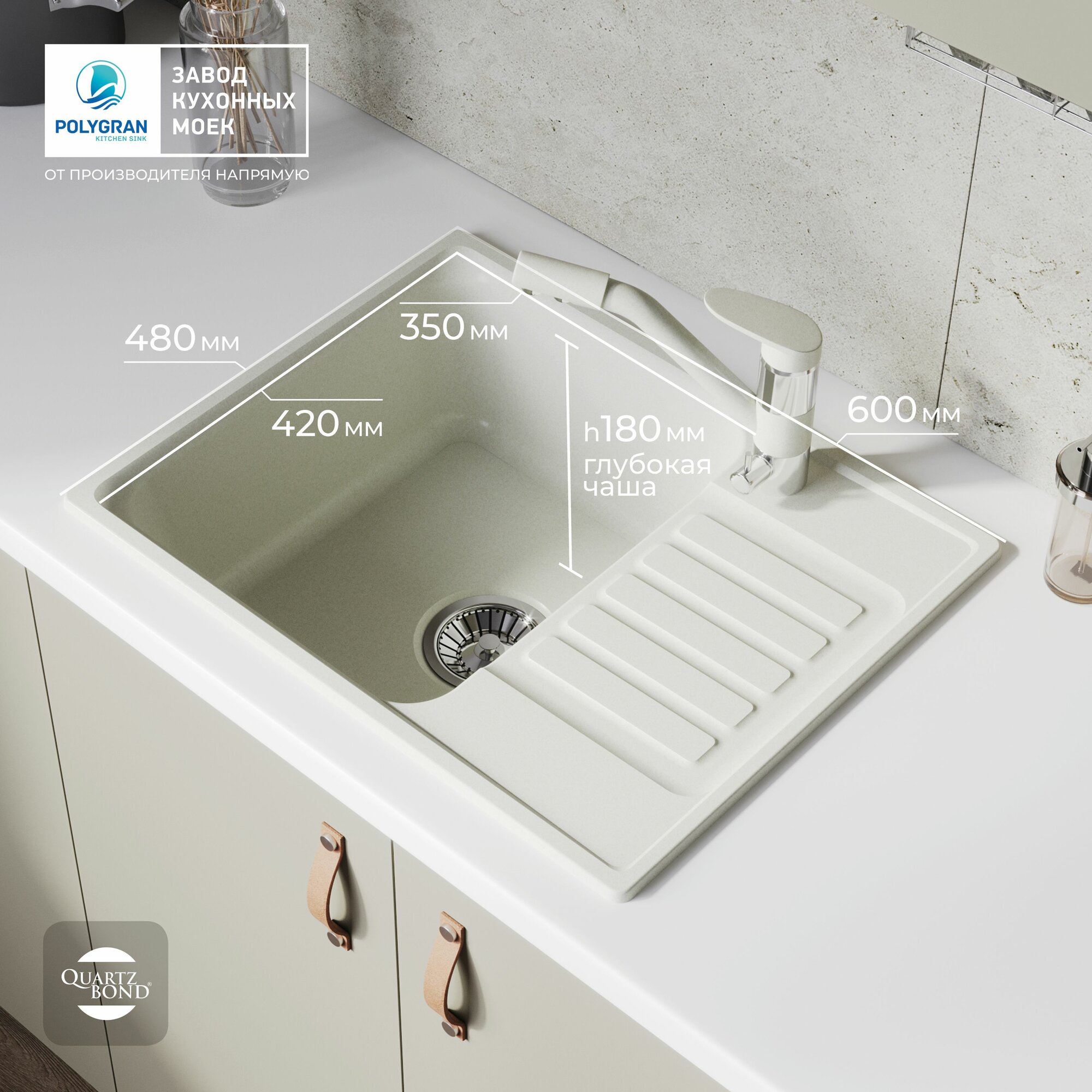 Кварцевая мойка для кухни QUARTZBOND BOND-600, лён, 600 х 480 х 180