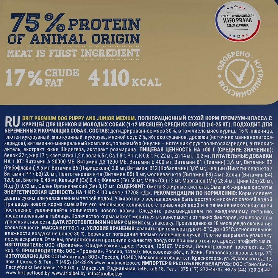 BRIT PREMIUM DOG PUPPY & JUNIOR MEDIUM для щенков и молодых собак средних пород с курицей (1 + 1 кг)