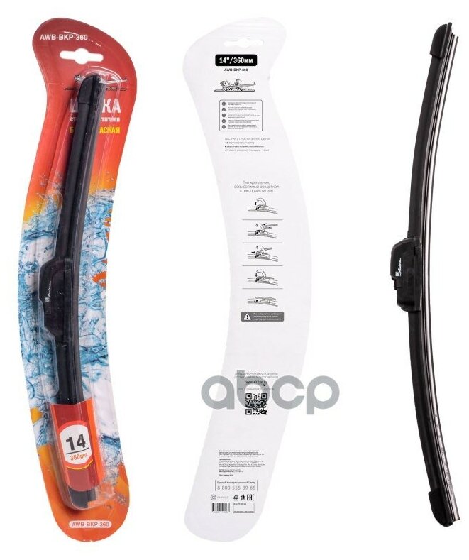 Щетка стеклоочистителя 360мм (14 дюйм) бескаркасная, 1 адаптер (hook 9x3), AWB-BKP-360