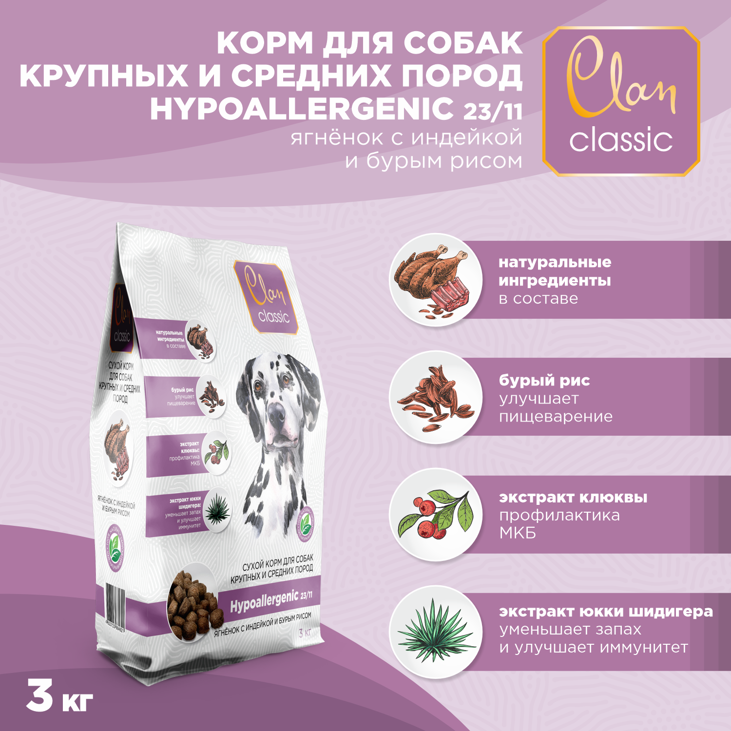 Корм для собак Корм для собак крупных и средних сухой CLAN Classic Hypoallergenic гипоаллергенный, ягненок и индейка с бурым рисом, 3кг