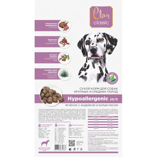 Корм для собак крупных и средних пород CLAN CLASSIC Hypoallergenic 23/11 ягненок/индейка/бурый рис 10 кг