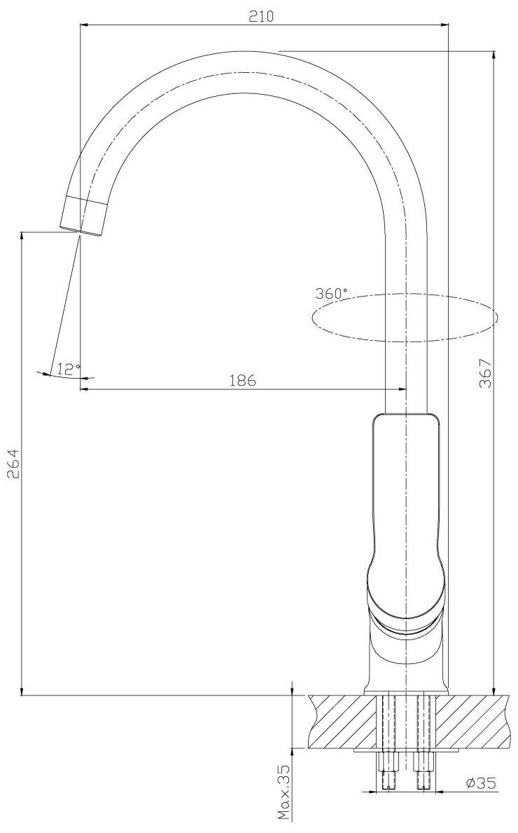 Смеситель однозахватный (35 мм) для кухни, с высоким поворотным изливом, RS27-23