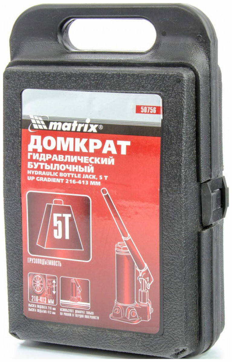 Лучшие цены. Гидравлический бутылочный домкрат Matrix 50756, в пластиковом кейсе, поднимает грузы массой до 5 т на высоту до 413 мм. За счет минимальной высоты подхвата 216 мм он оптимален для машин с большим клиренсом. Домкрат станет незаменимым помощником для автолюбителей при проведении технического обслуживания и ремонте авто в дороге или в гараже. Также он подходит для полупрофессионального применения на станциях ТО. Магазины в вашем городе.