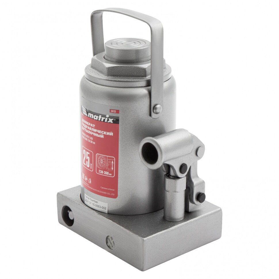 Лучшие цены. Гидравлический бутылочный домкрат Matrix 50733 используется для поднятия и фиксации грузов весом до 25 т на высоту 240-375 мм. Он подходит для автомобилей с высоким клиренсом. Домкрат станет незаменимым помощником для автолюбителей в гараже и дороге, а также для профессионалов на СТО.Преимущества Защиту от перегрузок обеспечивает клапан безопасности, не допускающий поднятия веса более допустимого.Чугунное основание и стальной корпус гарантируют надежность домкрата.Резьбовое соединение основания и корпуса. Магазины в вашем городе.