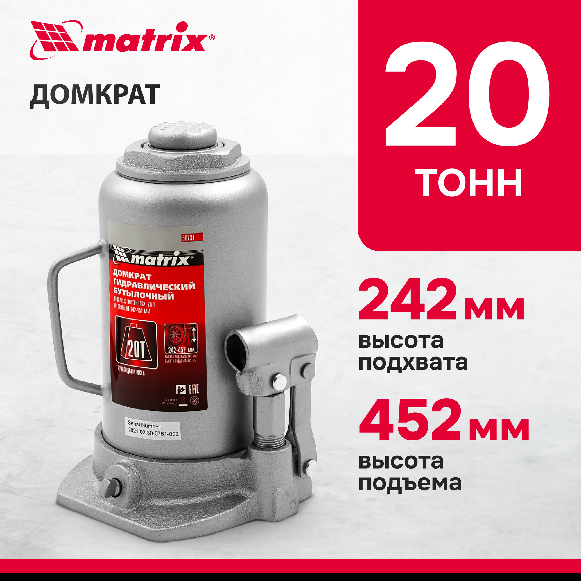 50731_Домкрат! Гидравлический Бутылочный, 20Т, H Подъема 242-452Мм Matrix арт. 50731