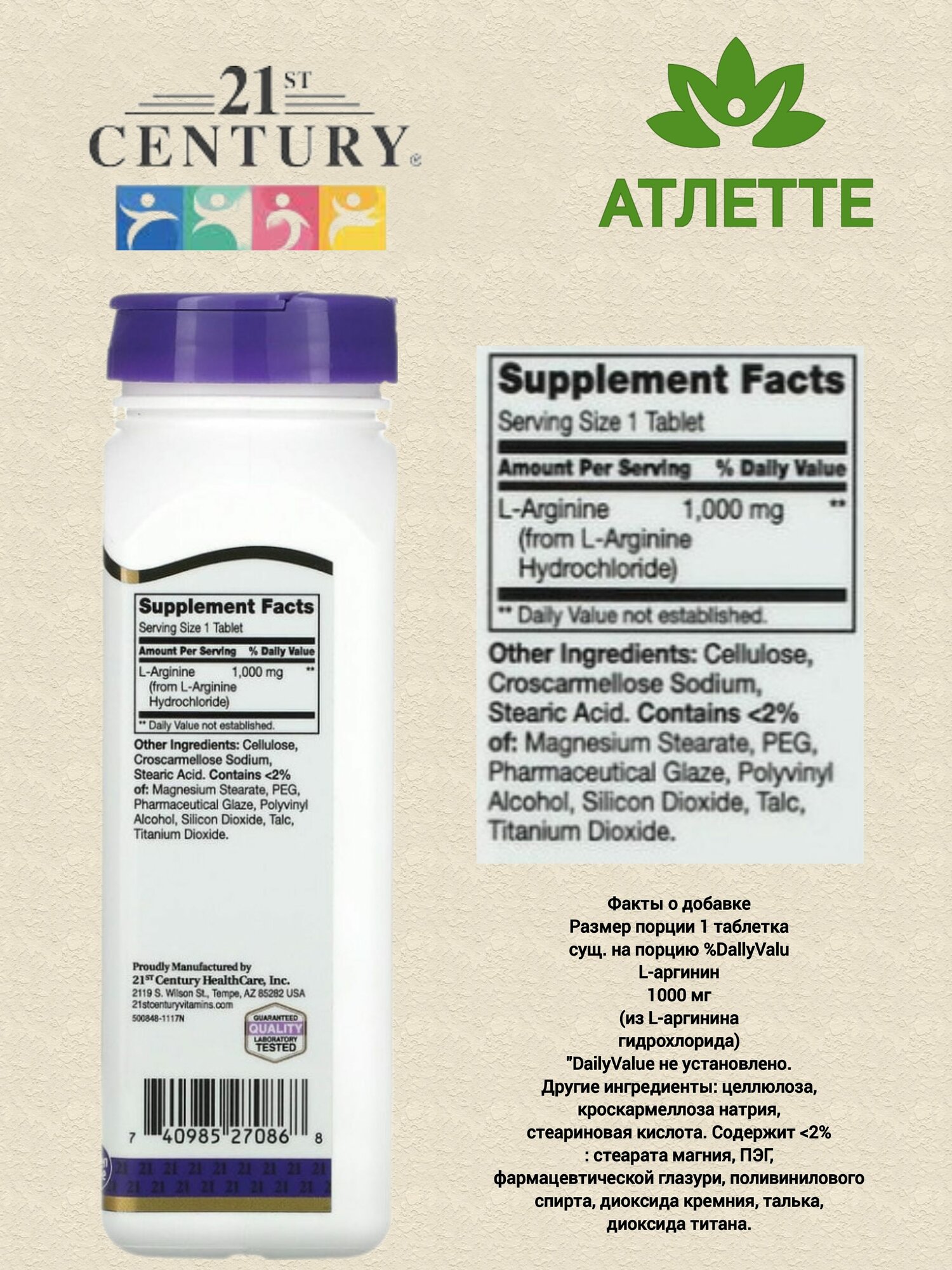 21st Century, L-аргинин, 1000 мг, 100 таблеток