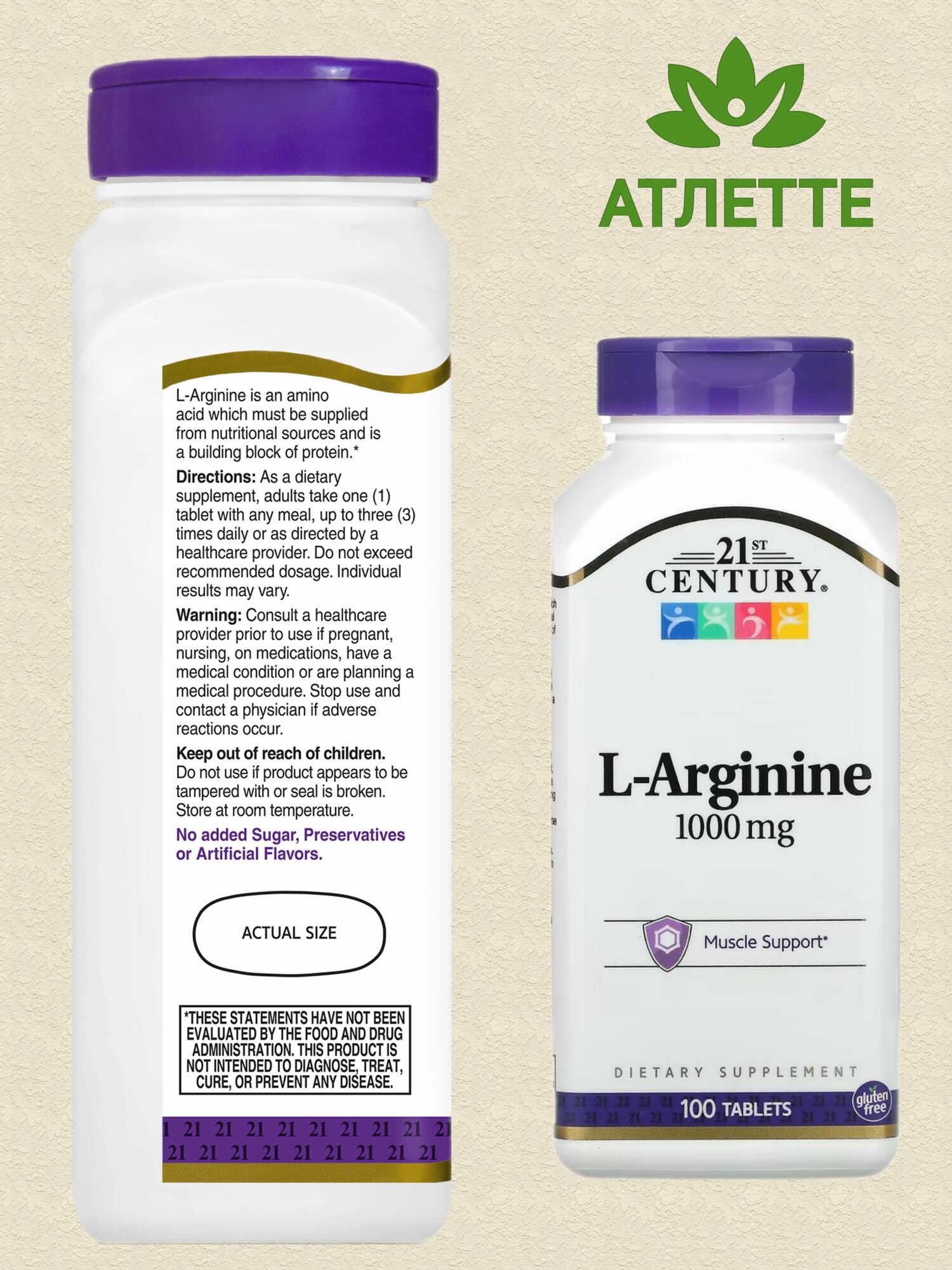 21st Century, Моно аминокислота спортивная L-аргинин, 1000 мг, 100 таблеток
