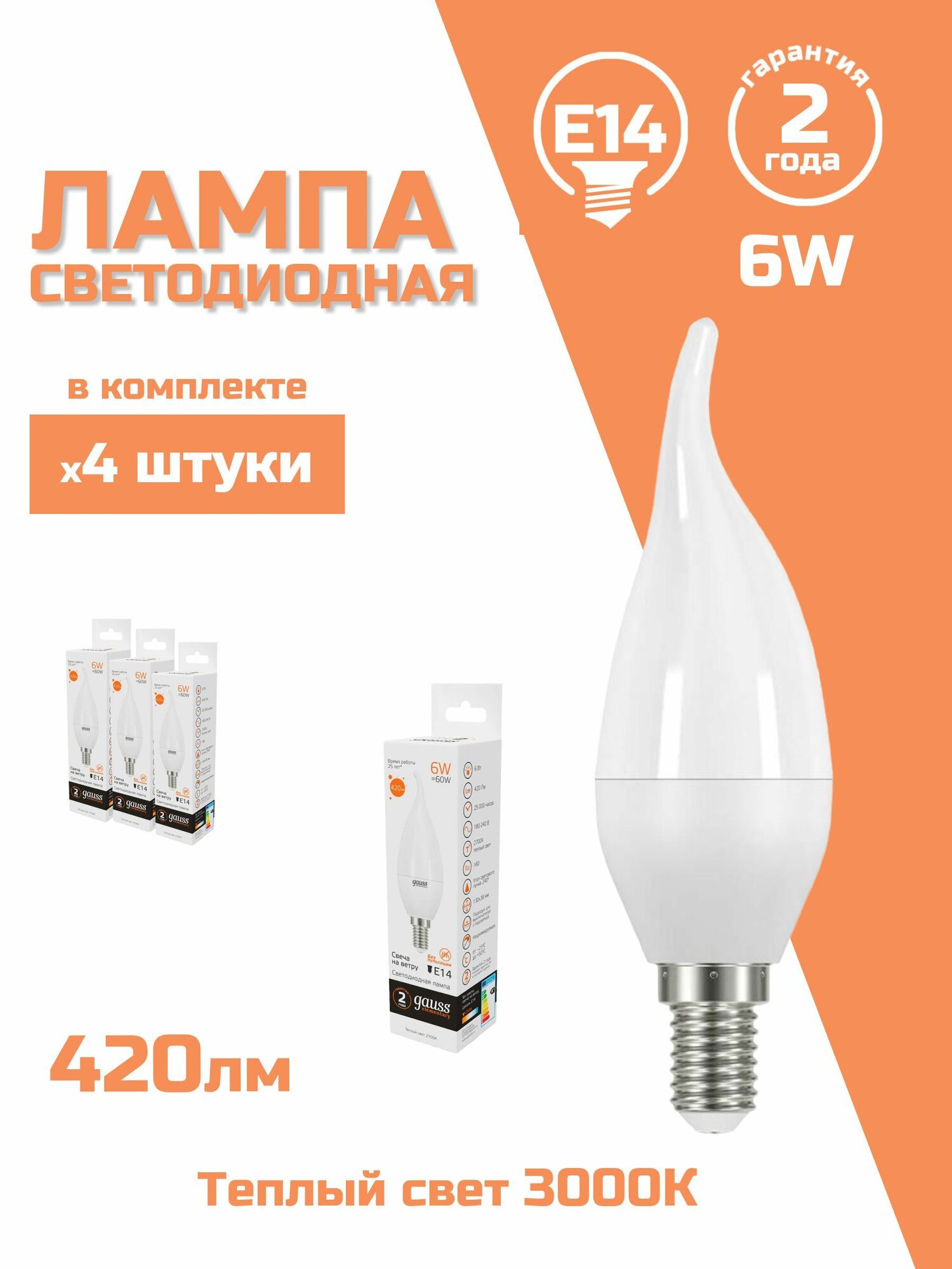 Лампочки Лампочка светодиодная Е14 Свеча на ветру 6W 420lm 3000K УПАКОВКА 10 шт. Gauss Elementary
