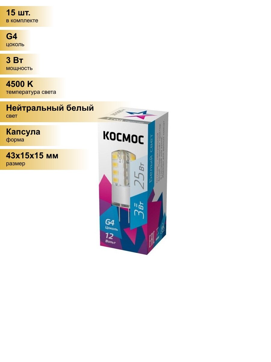 Лампочки (15 шт.) Светодиодная лампочка Космос G4 12V 3W(180lm) 4500K 4K 43x15 LksmLED3wJCG412v45 Нейтральный белый. Цоколь G4
