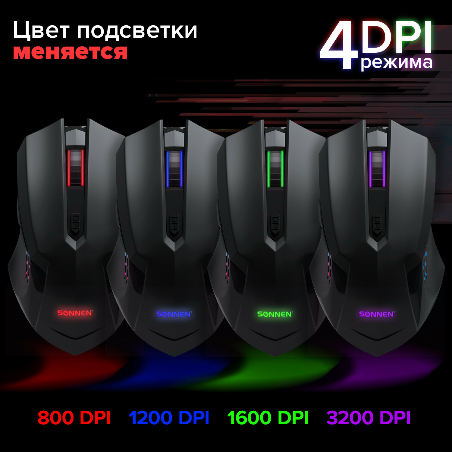 Мышь проводная игровая SONNEN I3, пластик, 6 кнопок, 800-3200 dpi, LED-подсветка, черная,513523