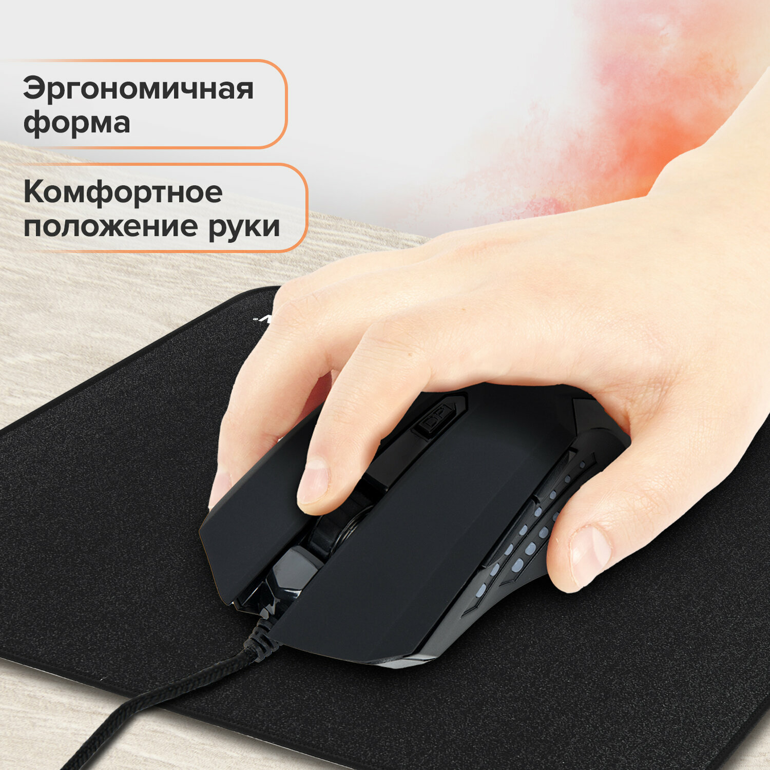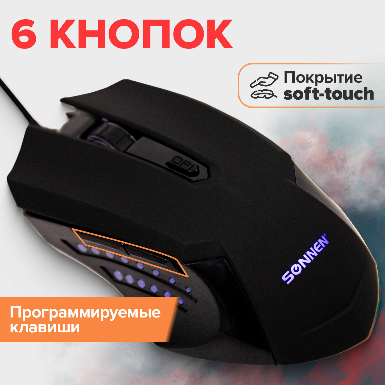 Мышь проводная игровая SONNEN I3 пластик 6 кнопок 800-3200 dpi LED-подсветка черная, 1 шт