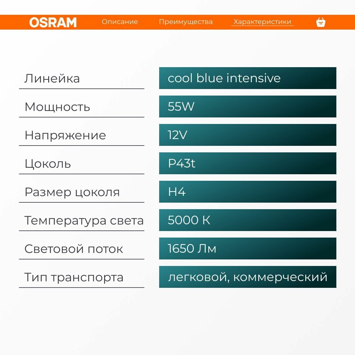 Лампа 12V H4 60/55W P43t 5000K Osram Cool Blue Intense 2 Шт. Duobox 64193Cbnhcb Osram арт. 64193CBNHCB