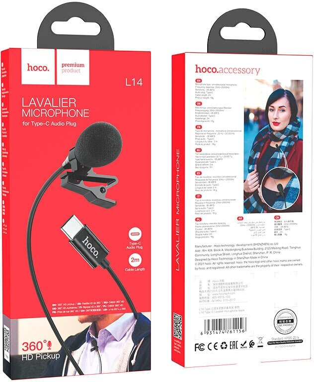 Проводной петличный микрофон Hoco L14 Lavalier, USB Type-C, 2м, черный