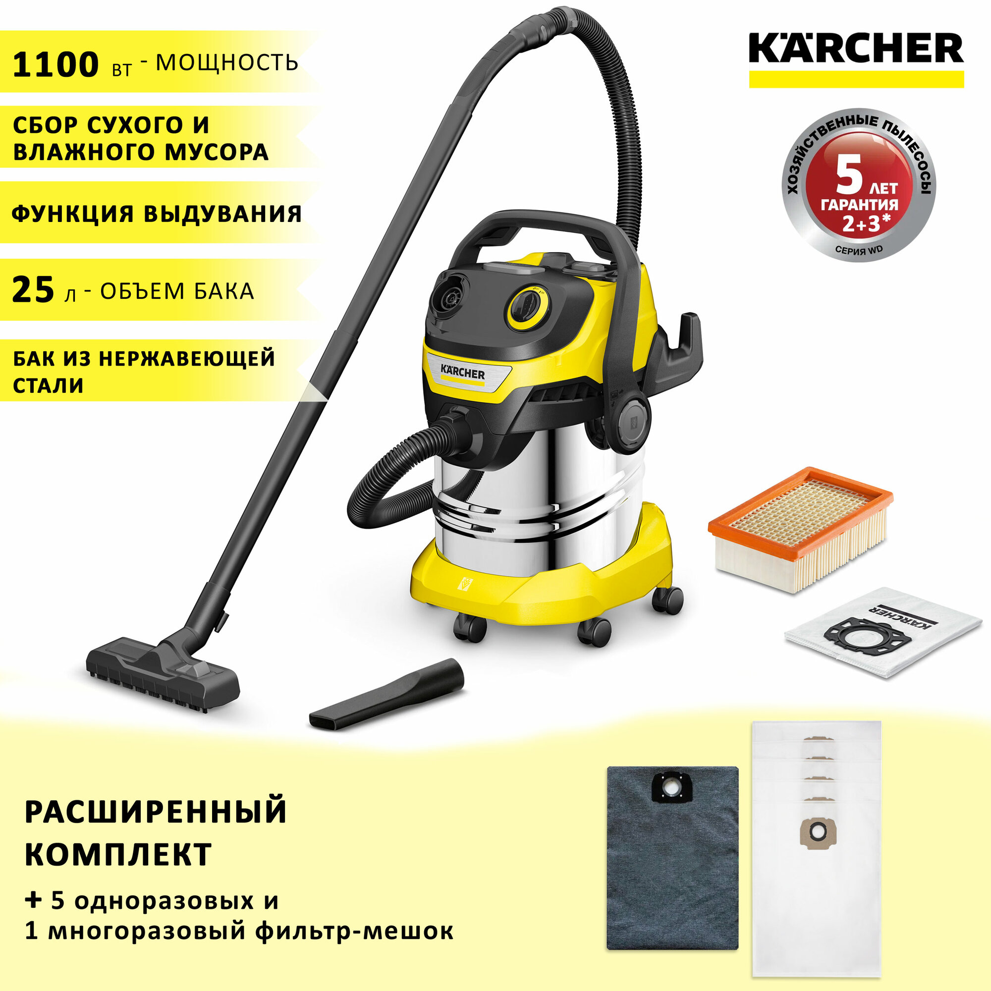 Хозяйственный пылесос Karcher WD 5 S V-25/5/22, всасывание жидкости, функция выдува, 1100 Вт, 25 л + 1 многоразовый и 5 одноразовых фильтр-мешков, дополнительный HEPA фильтр 36 090 ₽ Подробнее