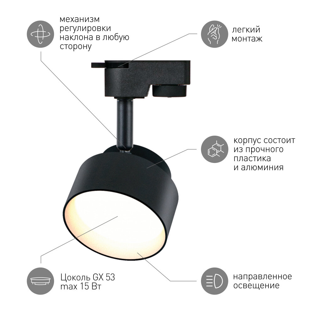 Светильник на трек однофазный 15Вт GX53 черный/серебро поворотный ЭРА