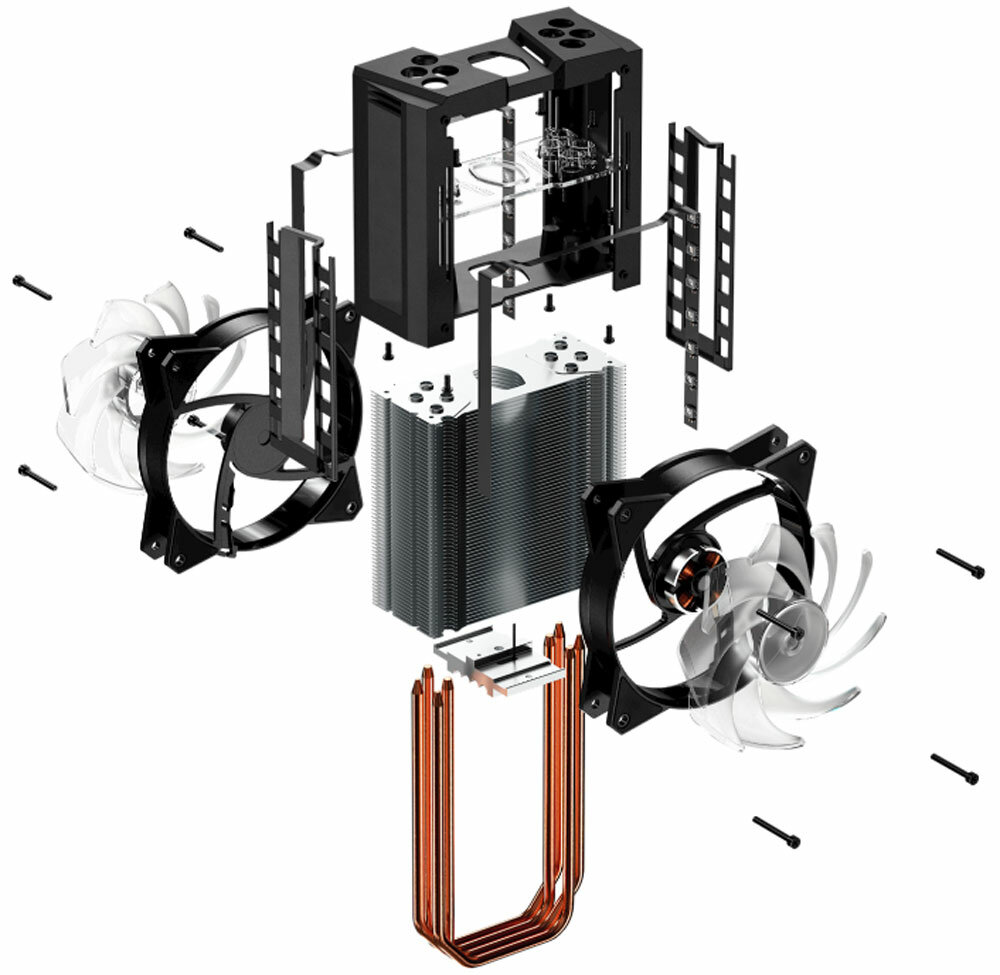 Кулер для процессора/ Cooler Master MasterAir MA410M (150W, 4-pin, 165.1mm, tower, Al/Cu, ARGB, fans: 2x120mm/53.38CFM/31dBA/1800rpm, 1200/115X/2066/2011-V3/2011/AM4/AM3/AM3+/AM2/AM2+/FM2/FM2+/FM1, ARGB Controller, 1700/AM5 only with bracket)