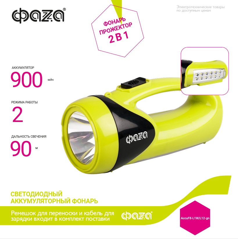 Фонарь универсальный AccuF8-L1W/L12-gn 1Вт 100лм + боков. панель 12х0.5Вт 110лм аккум. 900мА.ч зарядка: 220В/12В IP20 зел. ФАZА 5008922