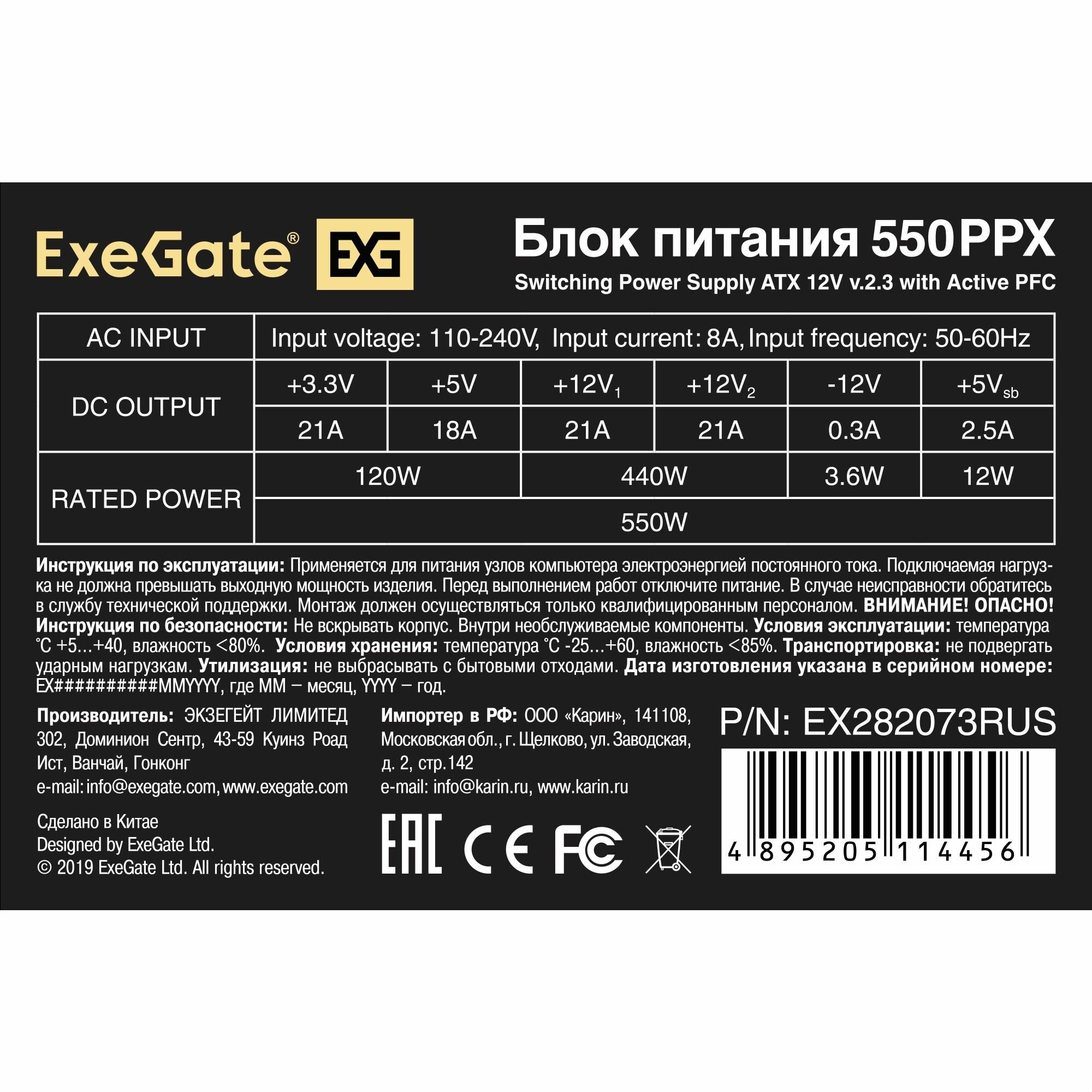 Exegate EX282073RUS Блок питания 550W 550PPX RTL, ATX, black, APFC, 14cm, 24p+(4+4)p PCI-E,4*IDE,5*S