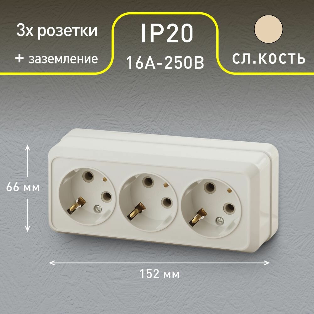 Розетка Розетка Intro Quadro 2-206-02 с заземлением трехместная 3х2P+E 16А-250В IP20 открытой установки слоновая кость