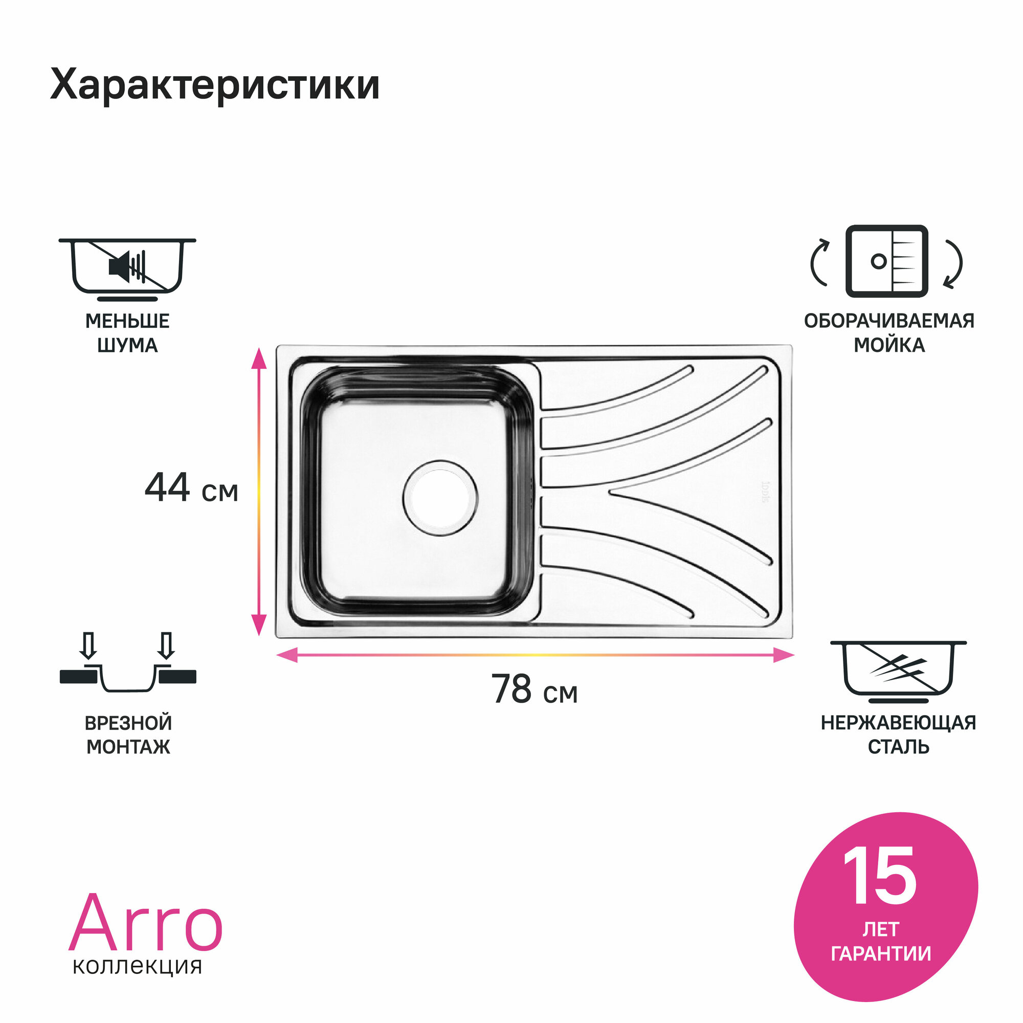 Кухонные мойки Мойка для кухни IDDIS Arro S ARR78SDi77 780*440, нержавеющая сталь, сатин