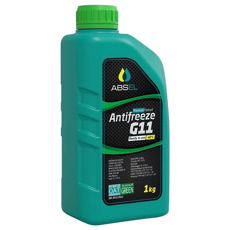 Охлаждающая жидкость ABSEL Антифриз гибридный G11 Зеленый -40C 1 кг ABSAFG110011 28084 ASTM D3306 SAE J 1034 TTM VAZ 1.97.717 - 97 Audi TL 774-C