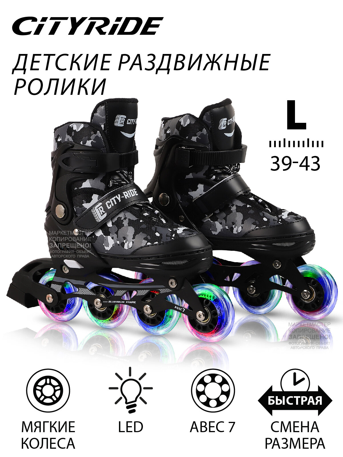 Роликовые коньки Роликовые раздвижные коньки детские CITYRIDE, PU колеса/все светятся, подшипники ABEC 7, размер L (39-42), черный