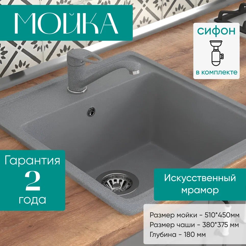 Квадратная кухонная мойка S-10 серая, из искусственного камня с сифоном 6 500 ₽ Подробнее