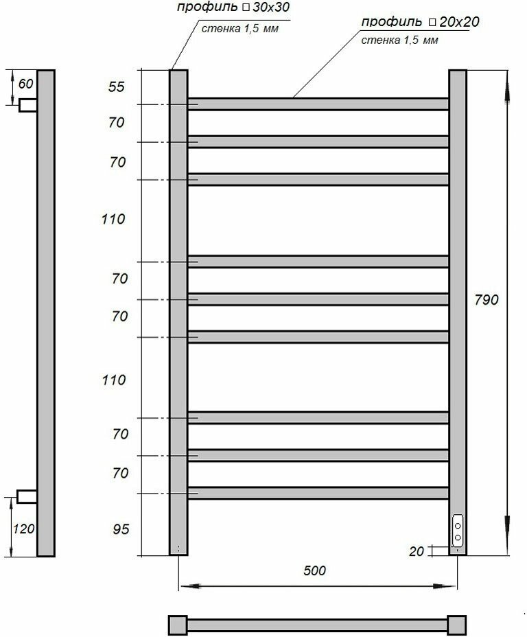 Полотенцесушитель электрический 500x800 POINT Вега (PN71858 П9) диммер справа