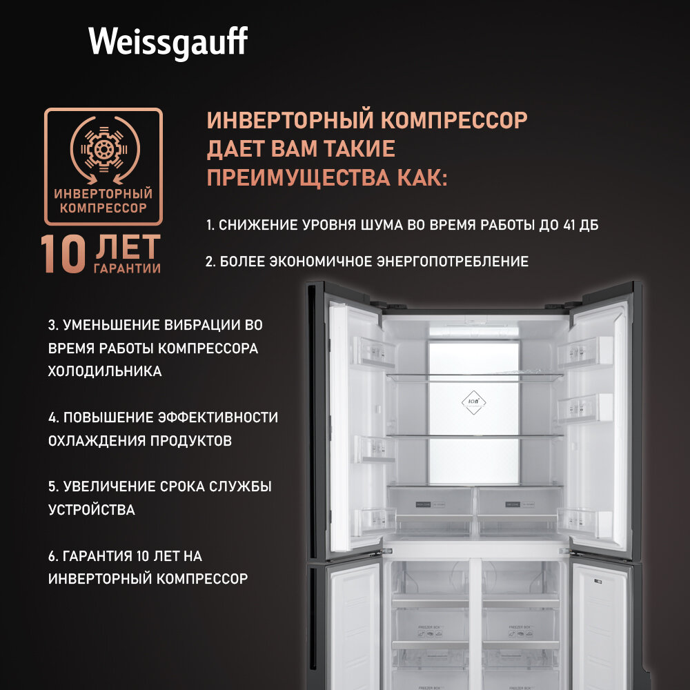 Отдельностоящий холодильник с инвертором Weissgauff WCD 450 X NoFrost Inverter четырехдверный холодильник, 3 года гарантии, система ионизации воздуха, большой объем, тихий режим, Зона свежести с контролем уровня влажности, LED-освещение 72 164 ₽ Подробнее