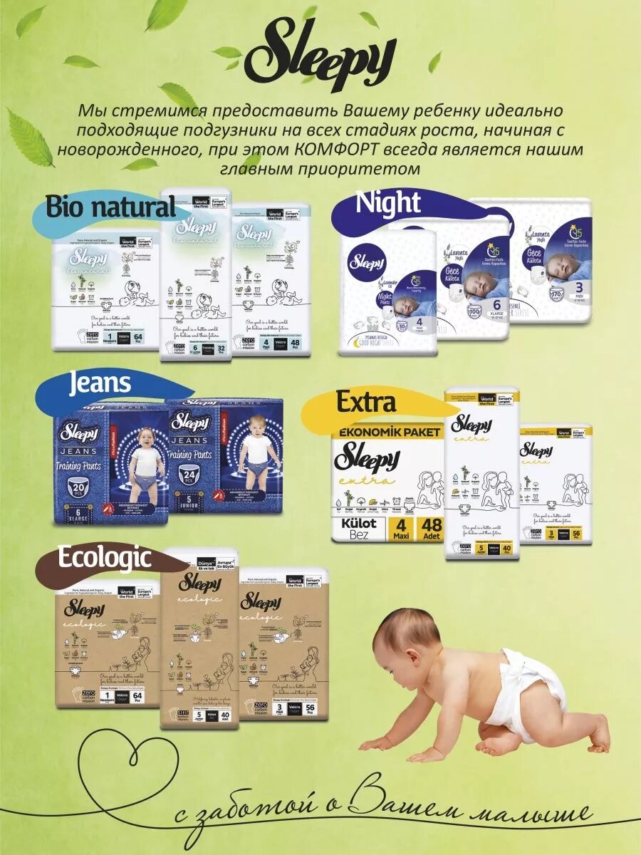 ЭКО Подгузники 4 размер, натуральное волокно, детские Sleepy Natural (9-16 кг), 52 шт 1 349 ₽ Подробнее