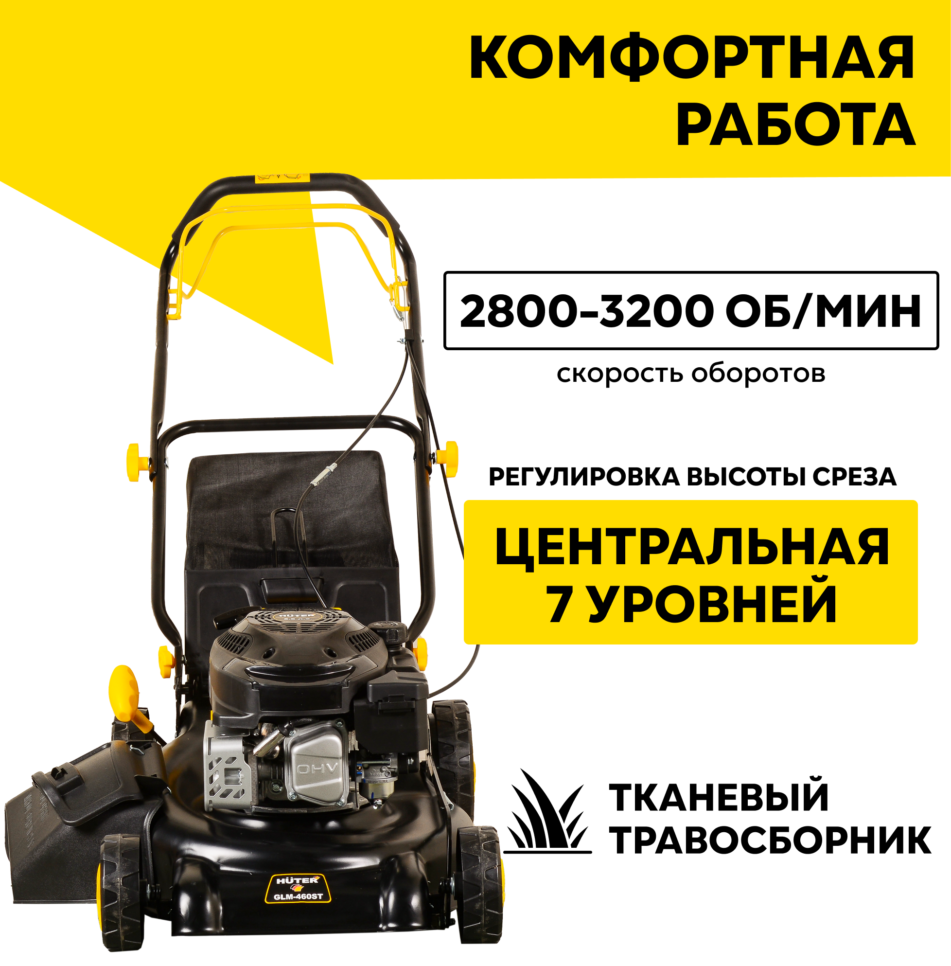 Газонокосилки Бензиновая газонокосилка HUTER GLM-460ST, 5 л. с. травосборник 60л, ширина скоса 46см